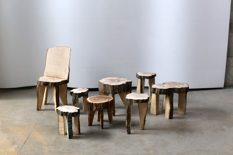 Chair, stools and coffee tables, uniques, Marigny-en-Orxois, 2021. Storms Noberto and Léon hit France at the beginning of March 2020, they uprooted many trees, including this hornbeam tree with a sinuous trunk in my in-laws garden. The original shape of the trunk made me want to create furniture there, each piece is unique thanks to…